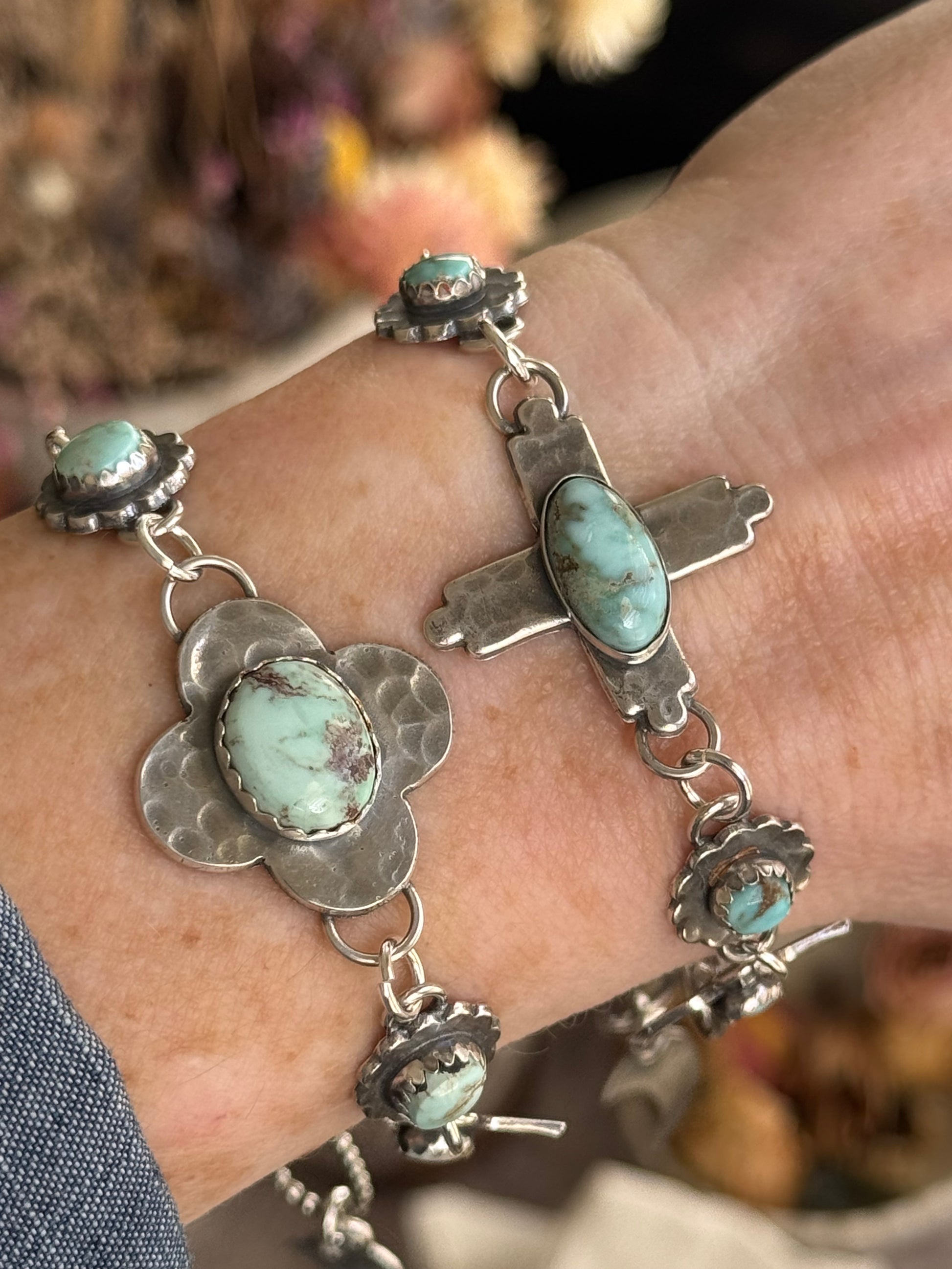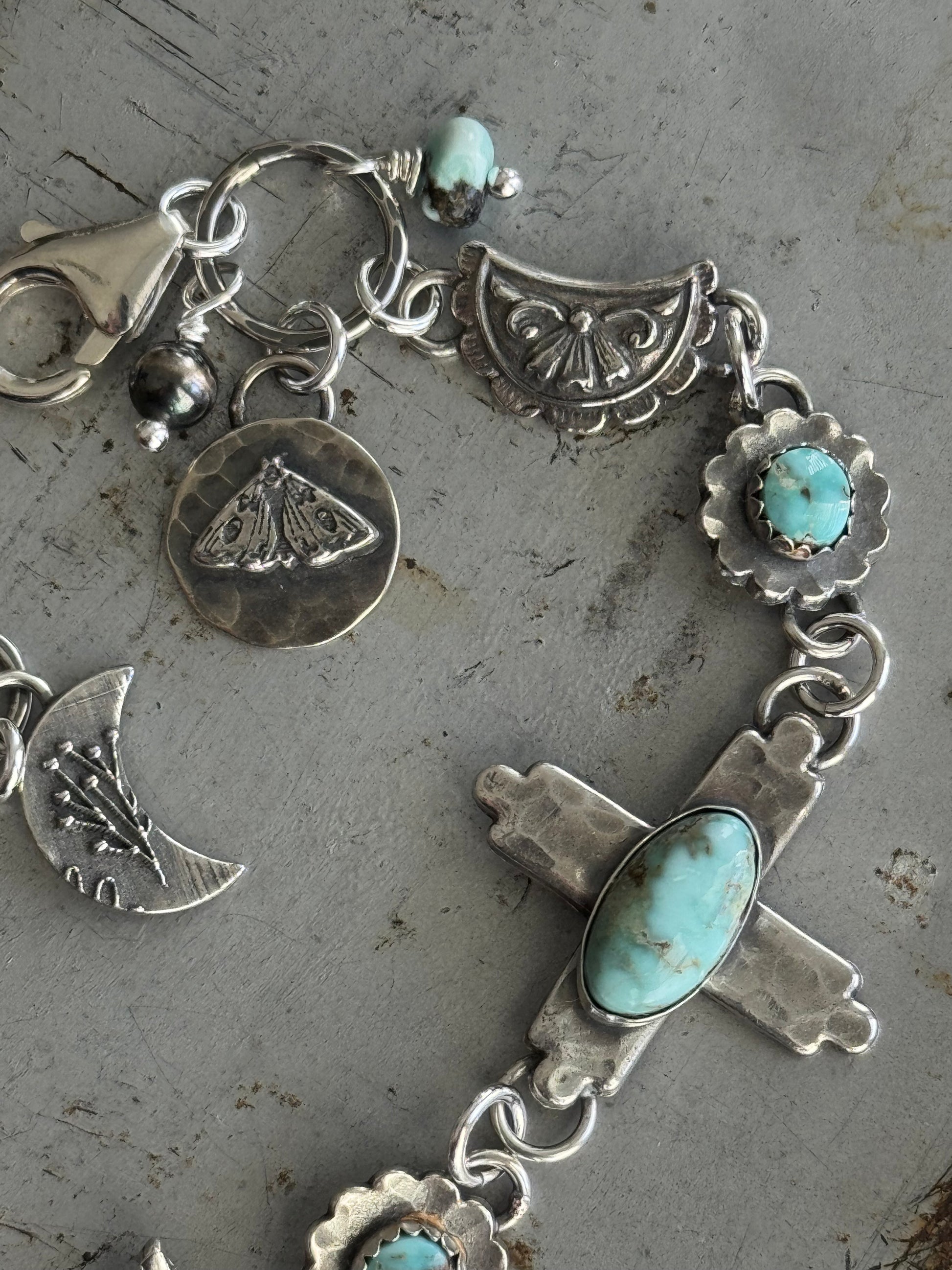 This beautiful bracelet features Dry Creek Turquoise. All of my work is handcrafted with sterling, fine silver and sterling silver metal clay. I love blending all the elements to create unique, individual pieces that tell their own story. Love is poured into each and every piece I make. There are various hand crafted sterling links. This one of a kind bracelet is hand stamped with my hallmark on the back for authenticity. It measure 6.5" - 8". If you need shorter or extra length, please message me after purchase. This listing is for one bracelet shown in the first few photos. All other bracelets in photos are sold separately