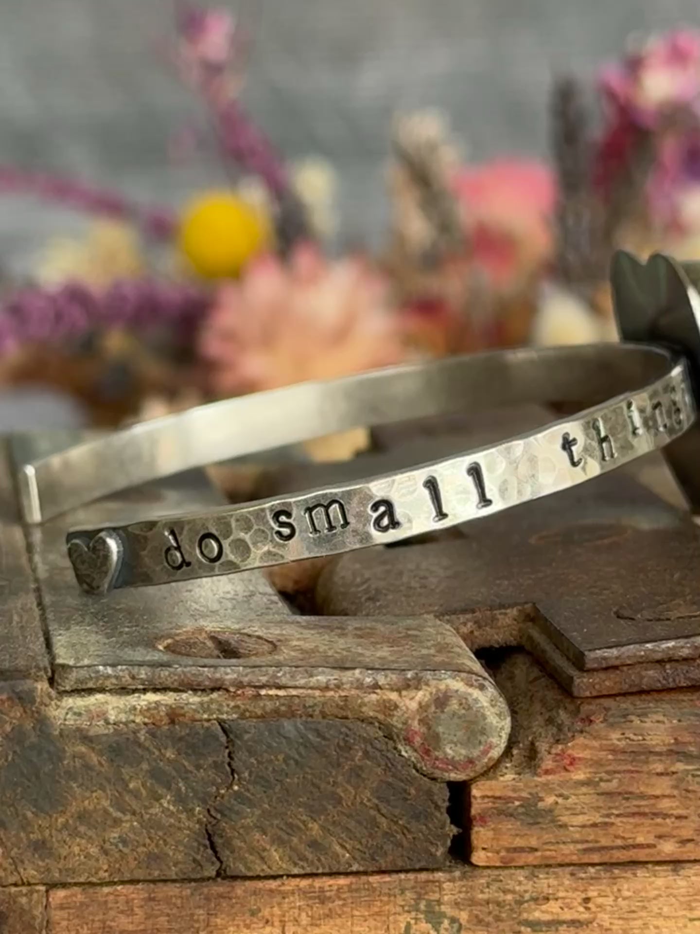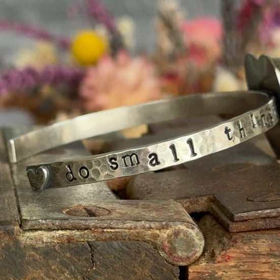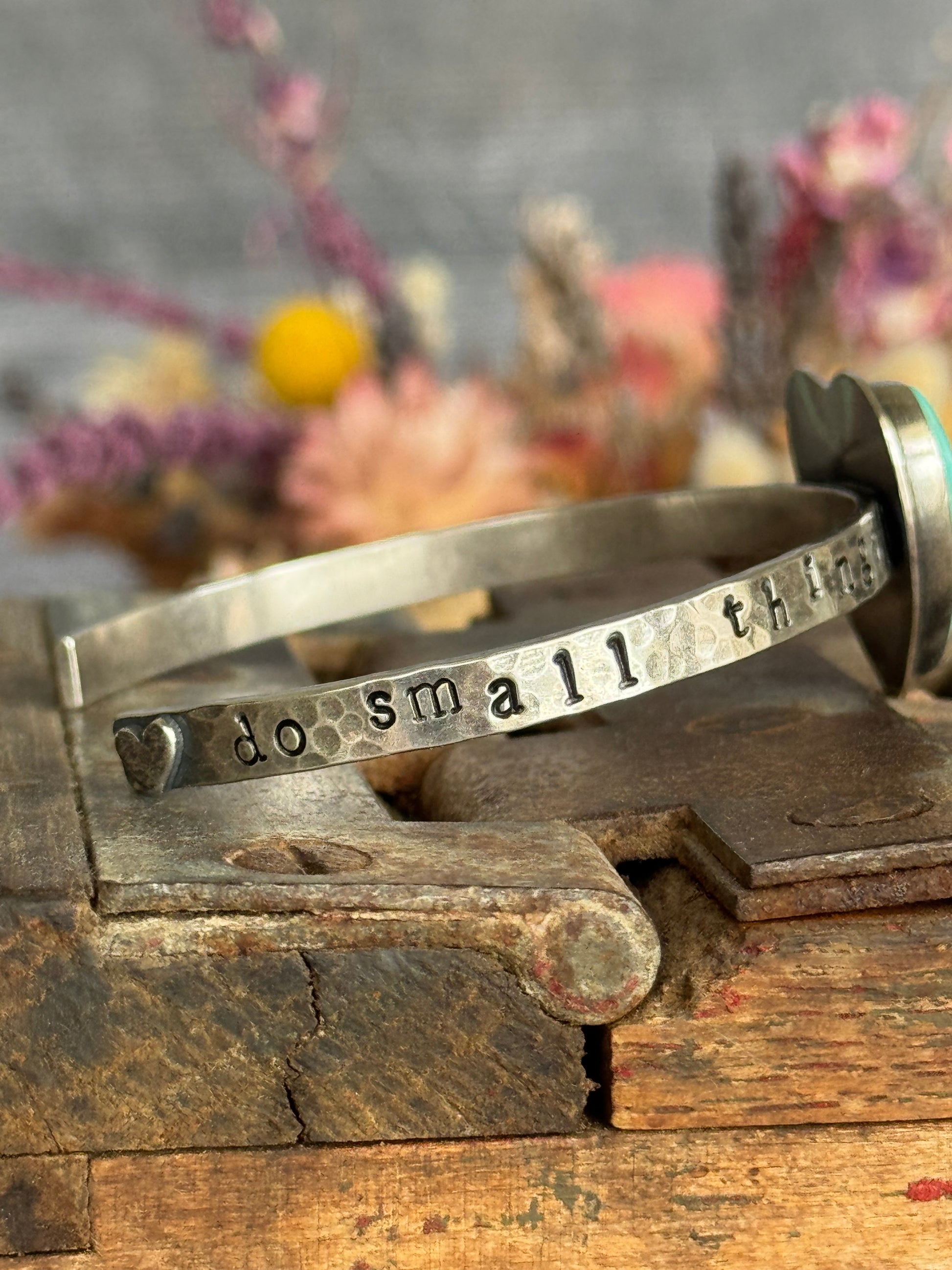 This sterling cuff is hand stamped with a beautiful quote from Mother Theresa "Do small things with great love" and also features a Kingman Turquoise heart. A tiny heart adorns one edge of the cuff. All of my work is handcrafted with sterling, fine silver and sterling silver metal clay. I love blending all the elements to create unique, individual pieces that tell their own story, crafted by my own hands. Love is poured into each and every piece I make. My hallmark is hand stamped on the back for authenticity. This cuff measures 6" with the standard 1" opening. Simply slip it on sideways over your wrist.