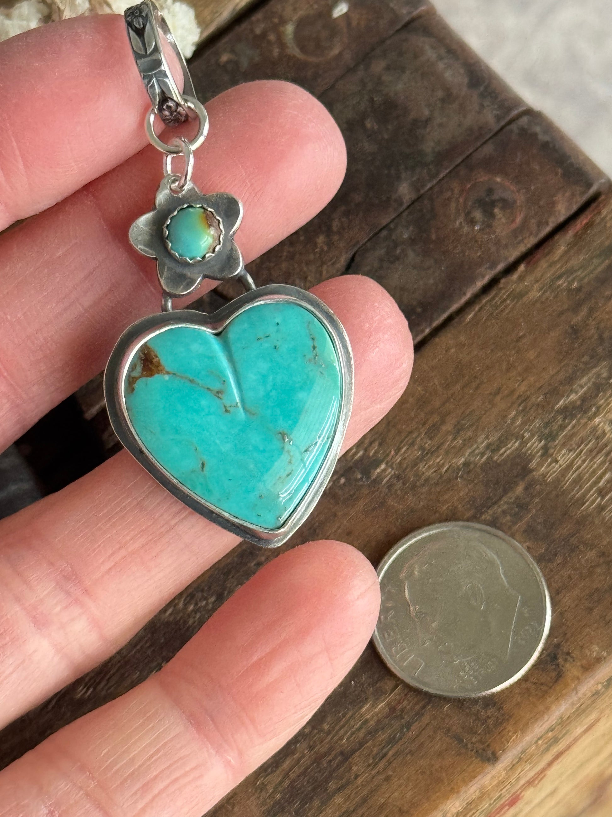 This beautiful Kingman Turquoise heart sits in a sterling setting with an accent Kingman Turquoise stone above it. These are connected and will fit on a necklace with 7MM beads or sterling pearls. It measures slightly over 1 3/4". All components are made by me. All of my work is handcrafted with sterling, fine silver and sterling silver metal clay. I love blending all the elements to create unique, individual pieces that tell their own story, crafted by my own hands. Love is poured into each and every piece I make. My hallmark is hand stamped on the back for authenticity.