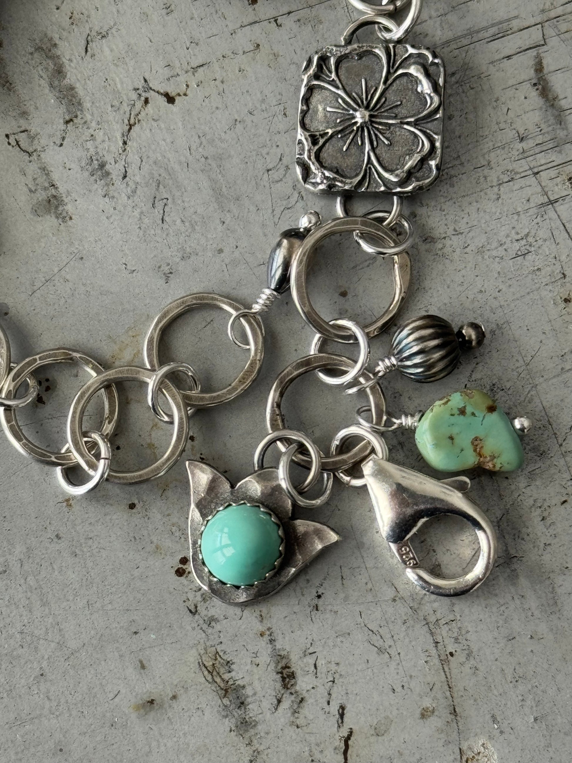 This beautiful bracelet features two Treasure Mountain Turquoise stones along with hand crafted sterling flower connectors, an accent Treasure Mountain bead and a tulip charm with a Lone Mountain Turquoise stone. This bracelet measures slightly 6.5 - 8". If you need to add a link for length, please contact me after purchase. All components are made by me. All of my work is handcrafted with sterling, fine silver and sterling silver metal clay. I love blending all the elements to create unique, individual pieces that tell their own story, crafted by my own hands. Love is poured into each and every piece I make. My hallmark is hand stamped on the back for authenticity. This listing is for one bracelet shown in the first few photos. All other jewelry items in photos are sold separately